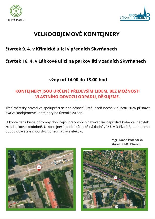 Městský obvod Plzeň 3 ve spolupráci se společností Čistá Plzeň opět připravil pro obyvatele Skvrňan přistavení velkoobjemových kontejnerů. Reaguje tak na dočasné uzavření sběrného dvora ve Skvrňanech, který v současnosti prochází rekonstrukcí.